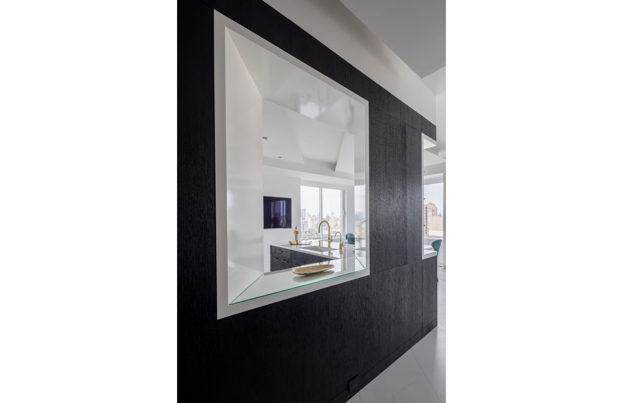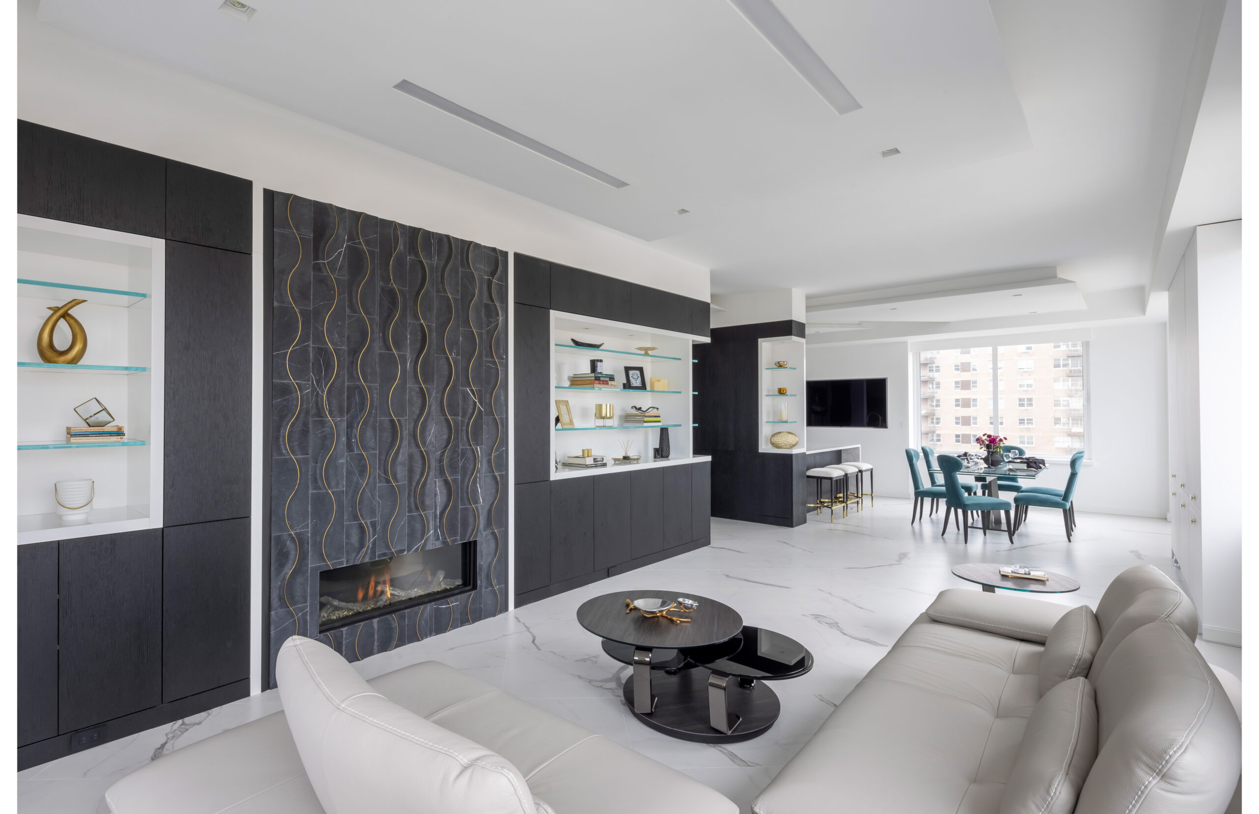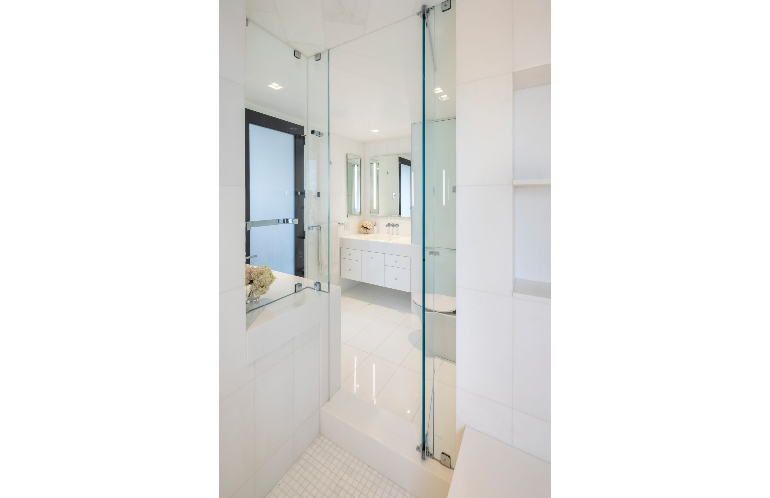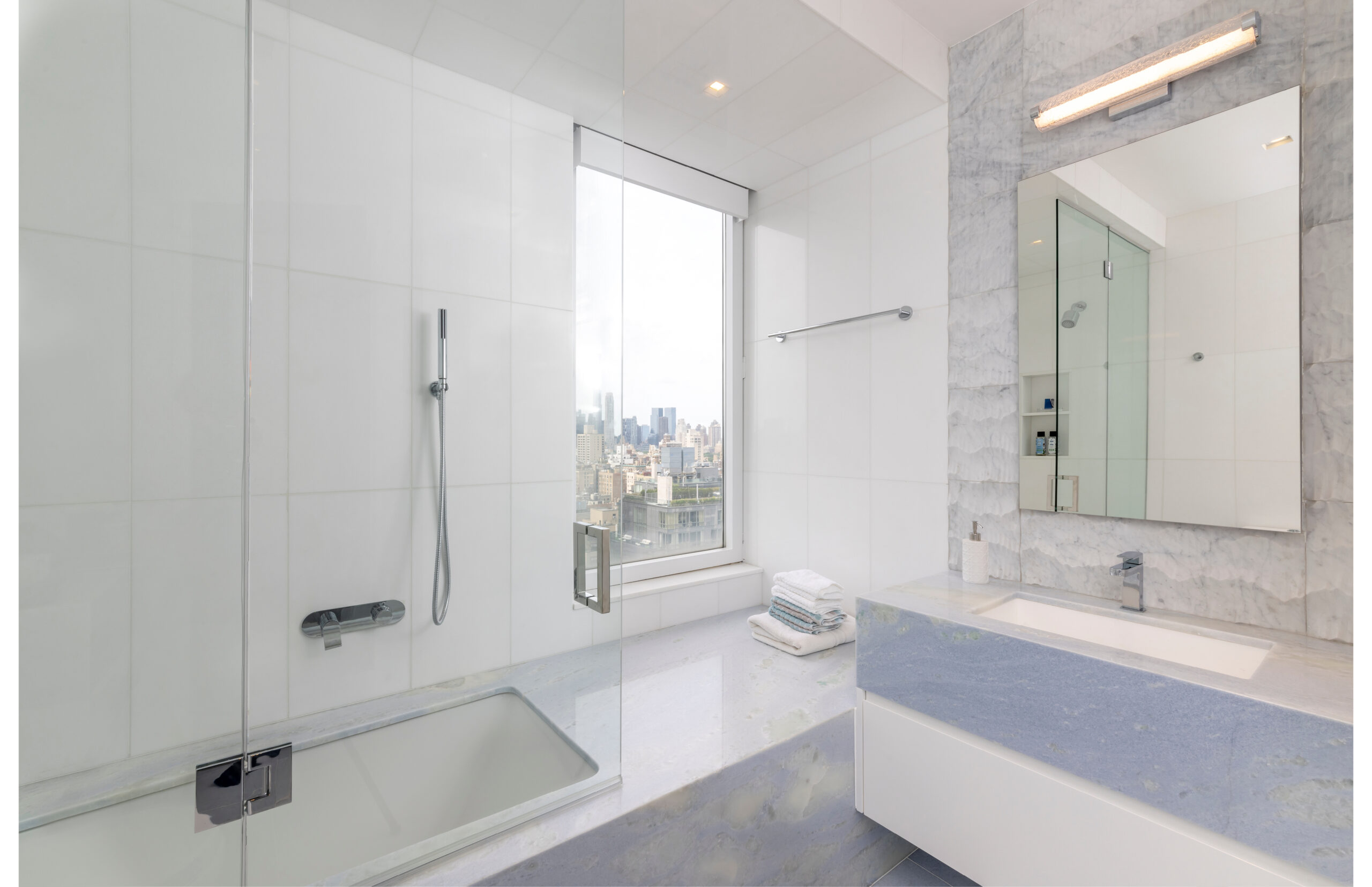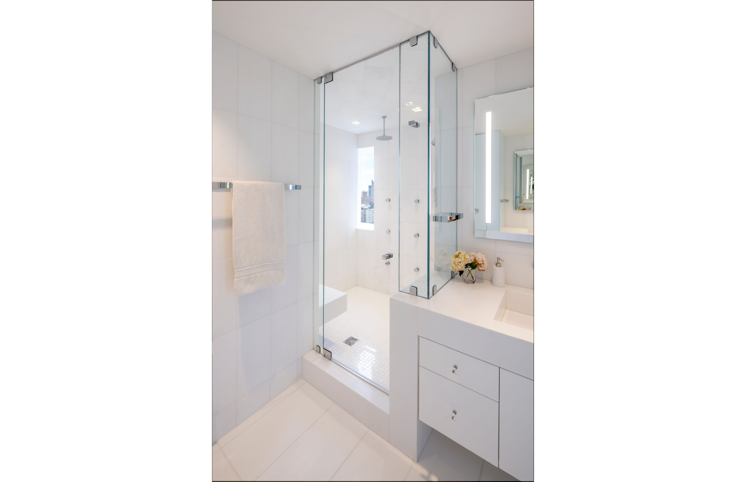 An Upper East Side penthouse apartment that displays 360-degree views stuns with a clean palette of white “marble” from lacquered cabinets and satin brass accents. A beautifully windowed bathroom with stone mosaics and custom-fitted marble slabs. Bathrooms have marble slabs, textured thassos, and mosaic detailing.