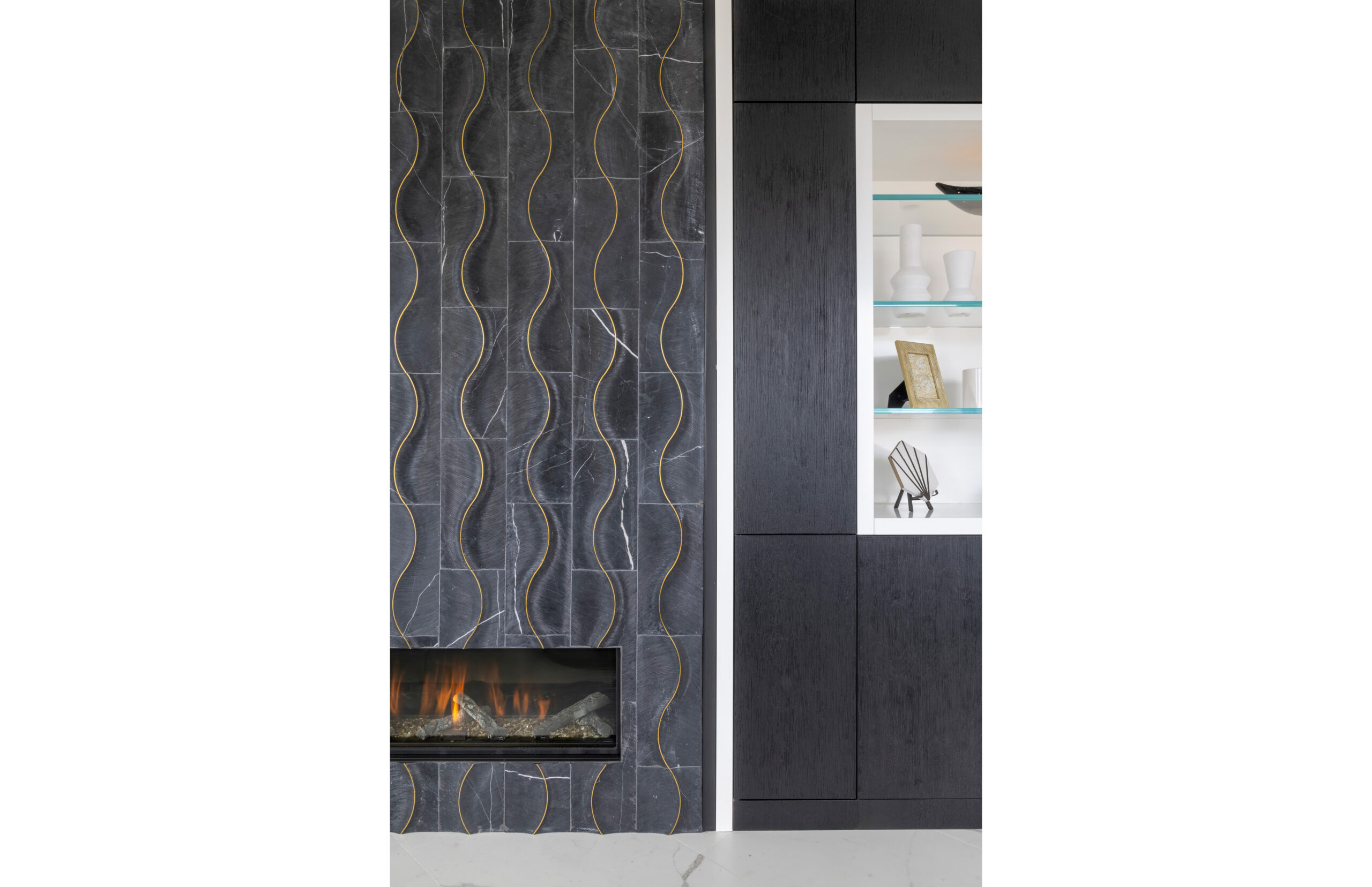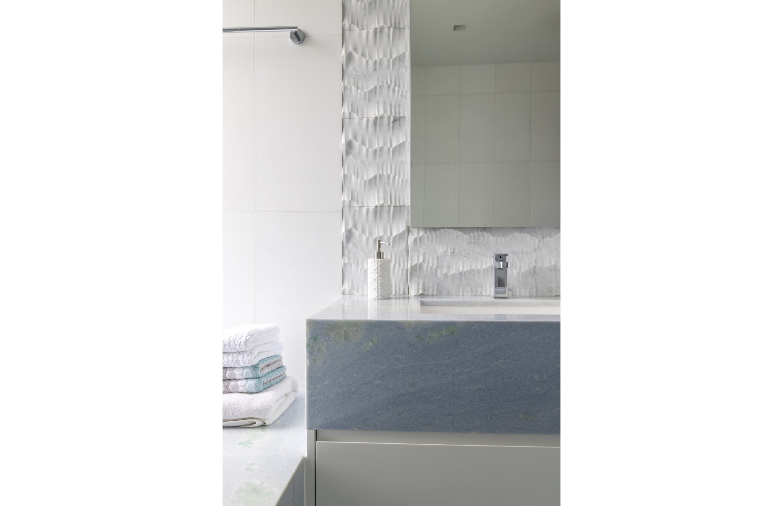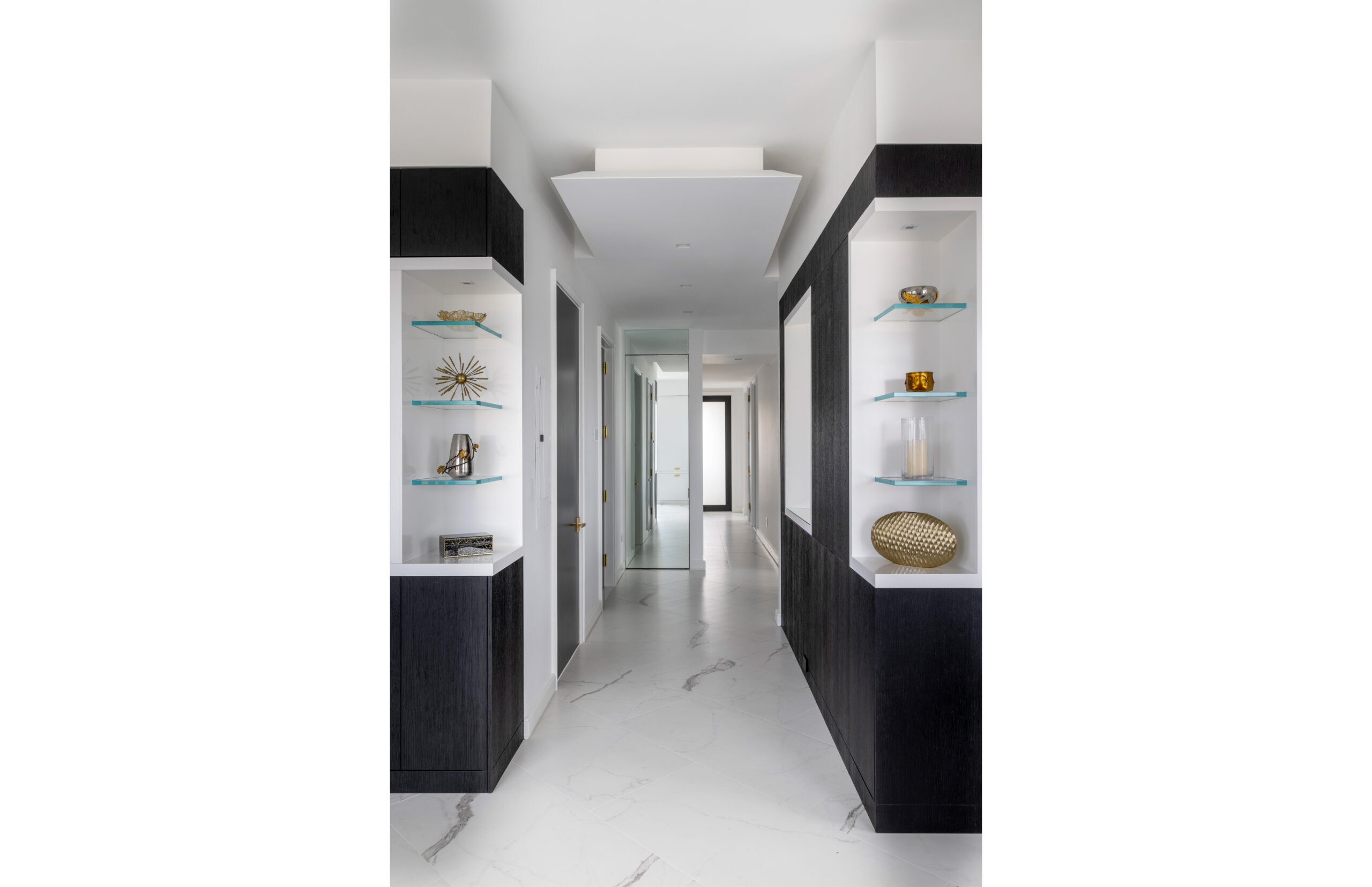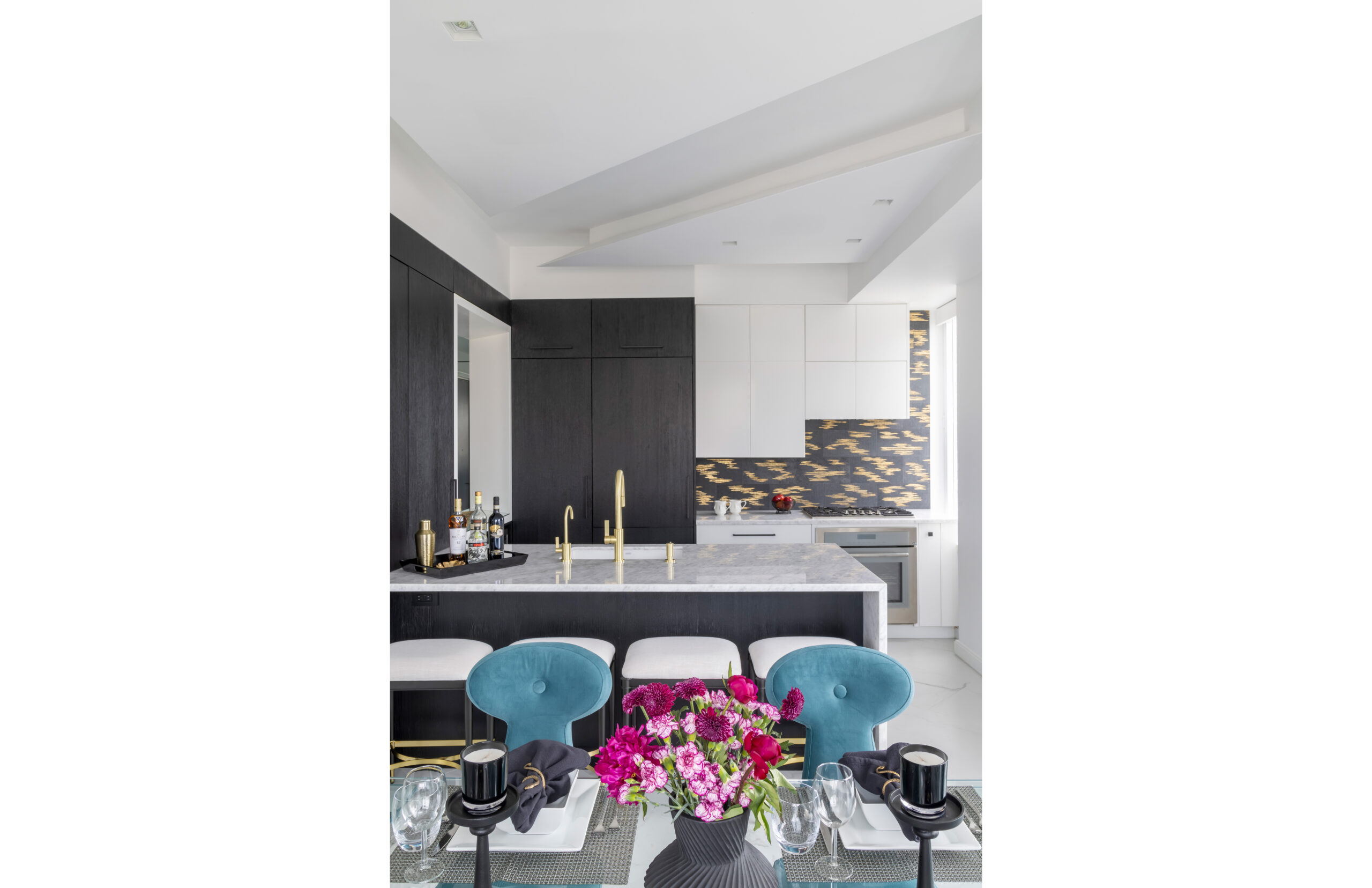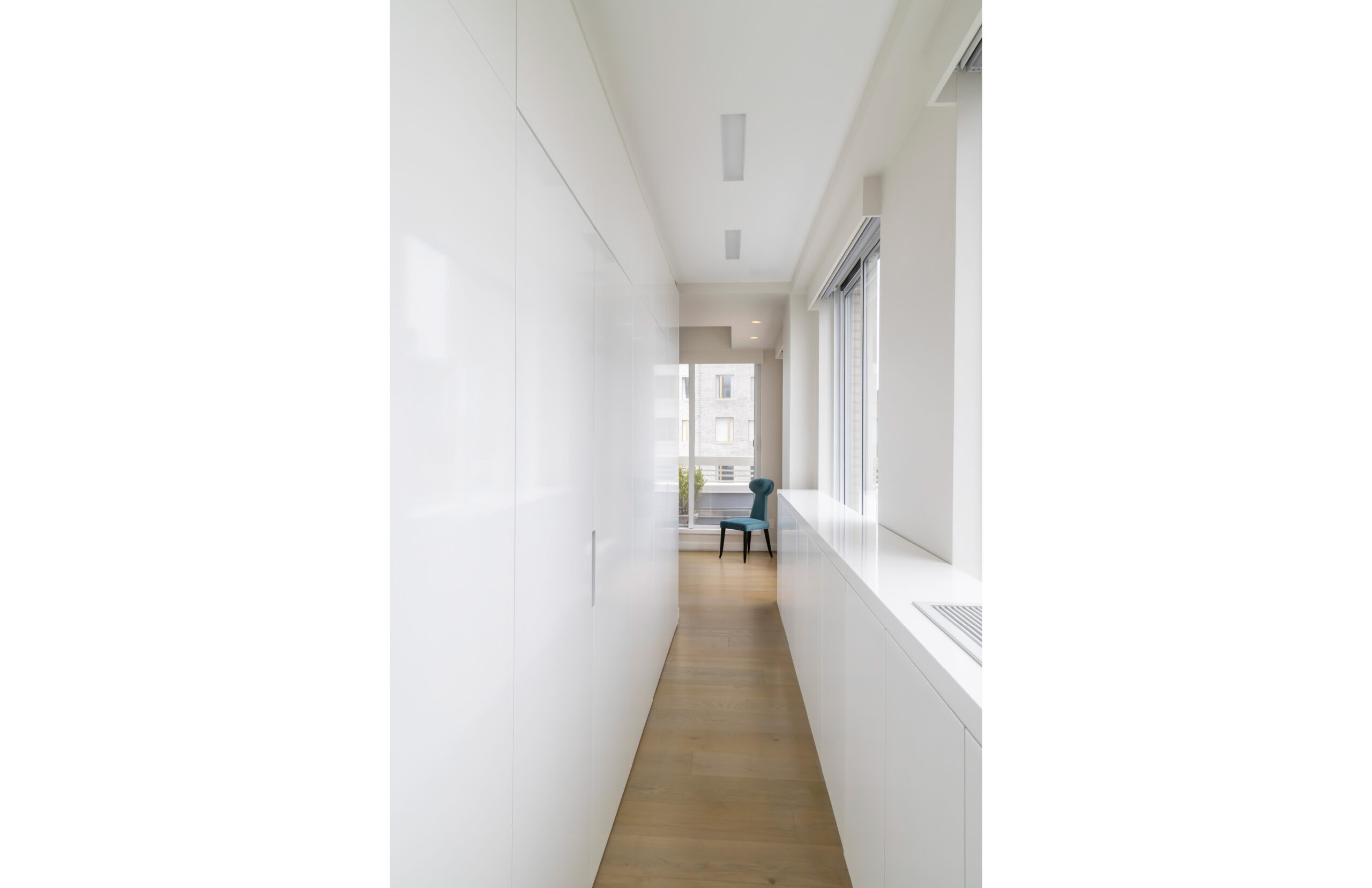 An Upper East Side penthouse apartment that displays 360-degree views stuns with a clean palette of white “marble” from lacquered cabinets and satin brass accents. A beautifully windowed bathroom with stone mosaics and custom-fitted marble slabs. Bathrooms have marble slabs, textured thassos, and mosaic detailing.